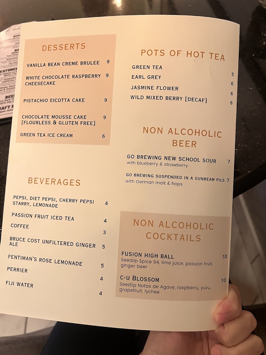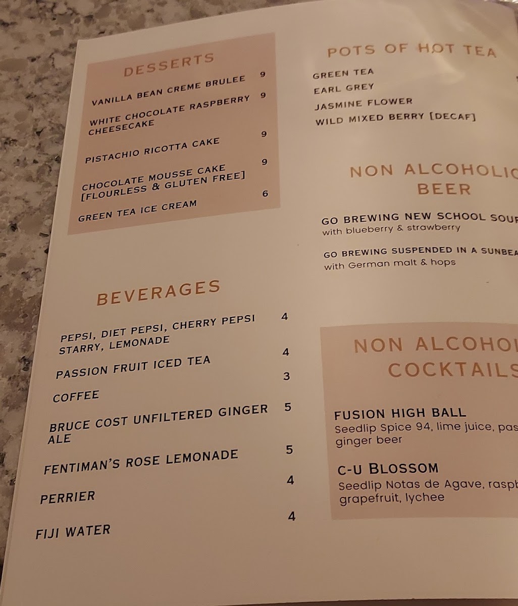 And for those with a sweet tooth, dessert is not to be overlooked. Treat yourself to a rich Flourless Chocolate Mousse Cake or a decadent White Chocolate Raspberry Cheesecake, each priced at $8.00, to bring your culinary journey to a delicious conclusion.